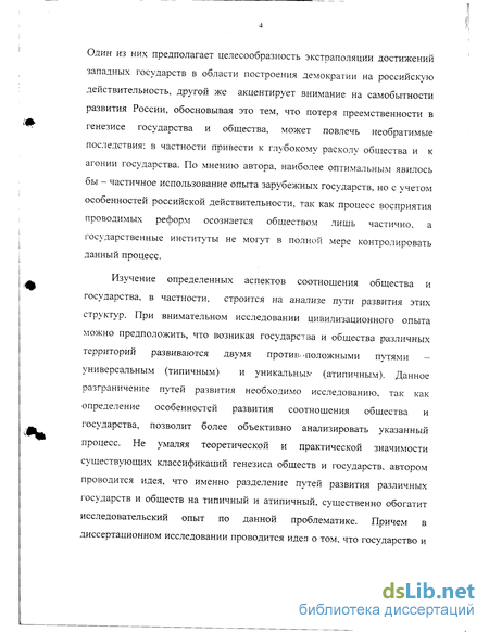 Один из них предполагает целесообразность экстраполяции достижений западных государств в области построения демократии на российскую действительность, другой же акцентирует внимание на самобытности развития России, обосновывая это тем, что потеря преемственности в генезисе государства и общества, может повлечь необратимые последствия; в частности привести к глубокому расколу общества и к агонии государства. По мнению автора, наиболее оптимальным явилось бы - частичное использование опыта зарубежных государств, но с учетом особенностей российской действительности, так как процесс восприятия проводимых реформ осознается обществом лишь частично, а государственные институты не могут в полной мере контролировать данный процесс.