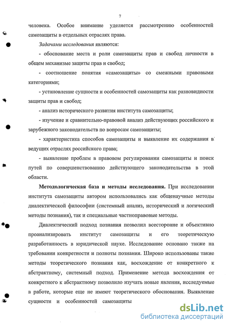 Методологическая база и методы исследования. При исследовании института самозащиты автором использовались как общенаучные методы диалектической философии (системный анализ, исторический и логический методы познания), так и специальные частноправовые методы.