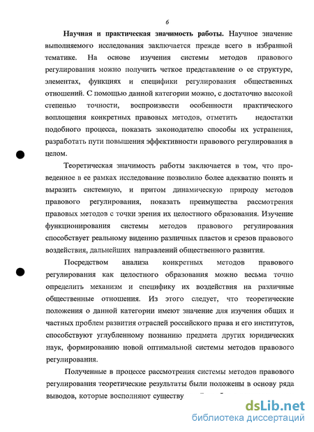 Теоретическая значимость работы заключается в том, что проведенное в ее рамках исследование позволило более адекватно понять и выразить системную, и притом динамическую природу методов правового регулирования, показать преимущества рассмотрения правовых методов с точки зрения их целостного образования. Изучение функционирования системы методов правового регулирования способствует реальному видению различных пластов и срезов правового воздействия, дальнейших направлений общественного развития.