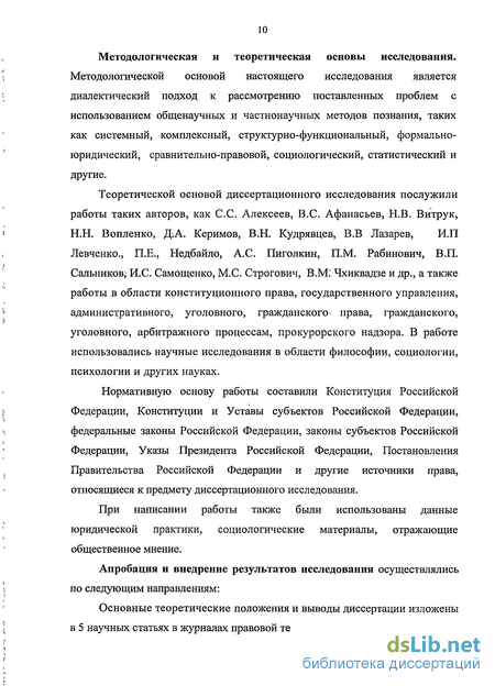 Теоретической основой диссертационного исследования послужили работы таких авторов, как С.С. Алексеев, B.C. Афанасьев, Н.В. Витрук, Н.Н. Вопленко, Д-.А. Керимов, В.Н. Кудрявцев, В.В Лазарев, И.П Левченко., П.Е., Недбайло, А.С. Пиголкин, П.М. Рабинович, В.П. Сальникову И.С. Самощенко, М.С. Строгович, В.М: Чхиквадзе и др., а также работы в области конституционного права, государственного управления, административного, уголовного, гражданского- права, гражданского, уголовного, арбитражного процессам, прокурорского надзора. В работе использовались научные исследования в области философии, социологии, психологии и других науках.