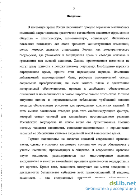 В настоящее время Россия переживает процесс серьезных масштабных изменений, затрагивающих практически все наиболее значимые сферы жизни общества - политическую, экономическую, социальную. Фактически последние пятнадцать лет стали временем концептуальных изменений, целью которых является становление России как демократического государства, где уважаются и защищаются права и свободы человека и гражданина как высшей ценности. Однако происходящие изменения- не могут сразу привести к положительному результату. Необходимо пережить определенное время, пройти этап переходного периода. Изменения действующей законодательной базы, реформы экономической сферы, социальные преобразования, не имея четкого плана и достаточной материальной обеспеченности, привели к дисбалансу общественных отношений и нестабильности в самом широком смысле этого слова. В такой ситуации полное и неукоснительное соблюдение требований законов является обязательным условием для преодоления кризисных явлений. В этом смысле законности отведена роль того стабилизирующего фактора, который станет основой для дальнейшего поступательного развития Российского государства на новом витке его существования. Именно поэтому тематика законности, социально-экономических и юридических гарантий ее обеспечения является актуальной темой в настоящее время.