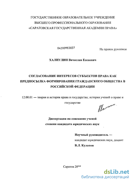 Степень научной разработанности темы: вопрос согласования интересов субъектов права как предпосылки становления гражданского общества специально не рассматривался на монографическом и диссертационном уровнях. Некоторым исключением может послужить работа А.Н. Гончаровой «Проблема согласования общественных и личных интересов в процессе построения гражданского общества», однако в ней рассматриваются лишь некоторые социологические и историко-философские аспекты этой проблемы.