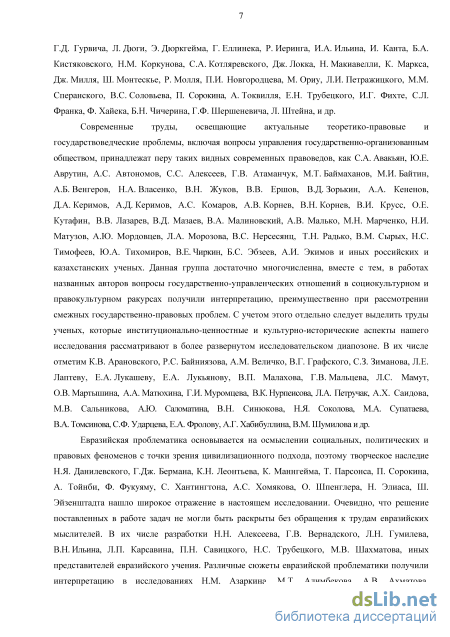 Евразийская проблематика основывается на осмыслении социальных, политических и правовых феноменов с точки зрения цивилизационного подхода, поэтому творческое наследие Н.Я. Данилевского, Г.Дж. Бермана, К.Н. Леонтьева, К. Маннгейма, Т. Парсонса, П. Сорокина, А. Тойнби, Ф. Фукуяму, С. Хантингтона, А.С. Хомякова, О. Шпенглера, Н. Элиаса, Ш. Эйзенштадта нашло широкое отражение в настоящем исследовании. Очевидно, что решение поставленных в работе задач не могли быть раскрыты без обращения к трудам евразийских мыслителей. В их числе разработки Н.Н. Алексеева, Г.В. Вернадского, Л.Н. Гумилева, В.Н. Ильина, Л.П. Карсавина, П.Н. Савицкого, Н.С. Трубецкого, М.В. Шахматова, иных представителей евразийского учения. Различные сюжеты евразийской проблематики получили интерпретацию в исследованиях Н.М. Азаркина, М.Т. Алимбекова, А.В. Ахматова, Ж.Д. Бусурманова, Г.Б. Гавриша, С. Глебова, А.Г. Дугина, Б.С. Ерасова, Е.И. Замараевой, В.Н. Жукова, И.А. Исаева, З.Н. Каландаришвили, Л. Люкса, С.Г. Кара-Мурзы, Р.А. Курбанова, Б.В. Назмутдинова, А.Н. Нысанбаева, Т.А. Мансурова, А.И. Овчинникова, С.П. Овчинниковой, А.С. Панарина, В.Я. Пащенко, А.Ю. Прудникова, Ю.И. Скуратова, Л.В. Сокольской, А.В. Шишковой, Ю.И. Шпилькина и мн. др.
