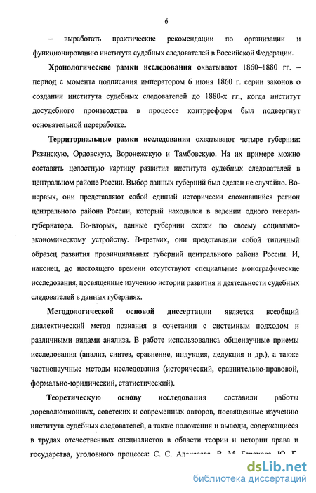 Территориальные рамки исследования охватывают четыре губернии: Рязанскую, Орловскую, Воронежскую и Тамбовскую. На их примере можно составить целостную картину развития института судебных следователей в центральном районе России. Выбор данных губерний был сделан не случайно. Во-первых, они представляют собой единый исторически сложившийся регион центрального района России, который находился в ведении одного генерал-губернатора. Во-вторых, данные губернии схожи по своему социально-экономическому устройству. В-третьих, они представляли собой типичный образец развития провинциальных губерний центрального района России. И, наконец, до настоящего времени отсутствуют специальные монографические исследования, посвященные изучению истории развития и деятельности судебных следователей в данных губерниях.