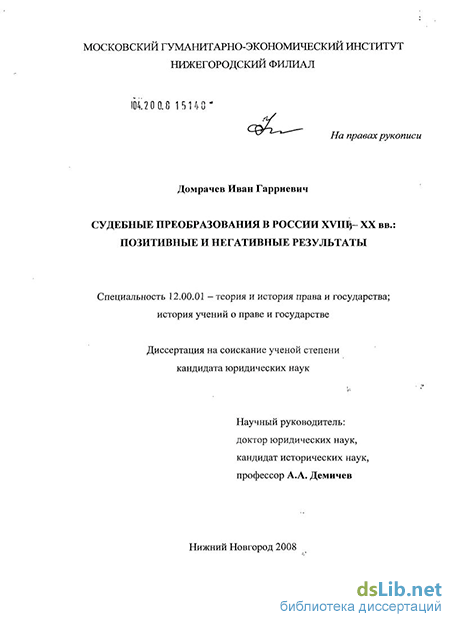 Цель исследования — определить позитивные и негативные закономерности с/дебных преобразований, проводимых в России в XVIII -XX вв