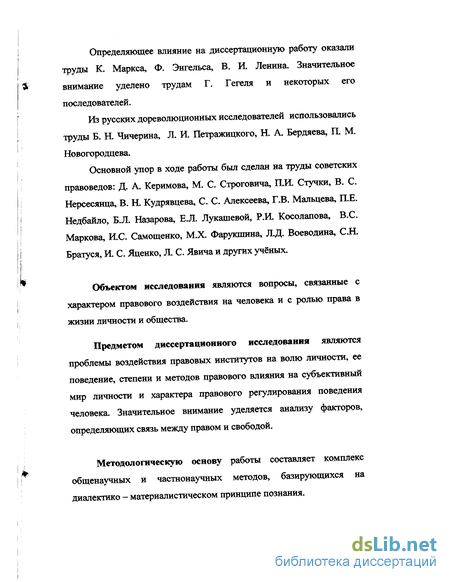 Предметом диссертационного исследования являются проблемы воздействия правовых институтов на волю личности, ее поведение, степени и методов правового влияния на субъективный мир личности и характера правового регулирования поведения человека. Значительное внимание уделяется анализу факторов, определяющих связь между правом и свободой.