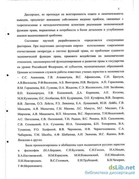 5 Диссертант, не претендуя на всесторонность охвата и окончательность выводов, предлагает вниманию собственное видение проблем, связанных с теоретическими и методологическими аспектами реализации экономической функции права, выраженные в потребности в более детальном и углубленном анализе вышеназванной проблемы.