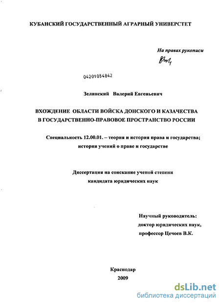 Актуальность темы исследования. Изучение проблем вхождения донского казачества в новое время (XV - начало XX вв.) в правовое пространство России является весьма важной задачей историко-правовой науки. Актуальность темы усиливается в Южном федеральном округе, в котором располагается Донской край, неподдельным интересом в возрождающейся казачьей среде, интересующейся своим богатым прошлым, своей самобытной культурой.