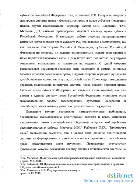 Теоретической основой исследования стали положения, содержащиеся в работах Гаджиева К.С., Кольева А.Н., Крыштановской О., Лапаевой В.В., Марченко М.Н., посвященные вопросам развития политической системы в целом и ее элементов в частности. При изучении характерных черт и особенностей системы современного российского права ценными оказались положения и выводы относительно конституционного и уставного законодательства субъектов Российской Федерации (В.В. Гошуляк, В.В. Иванов, И.А. Кравец, Н.М. Добрынин и др.), особенностей системы современного российского права (В.В. Гаврилов, В.Н. Карташов, В.Н. Синюков, СВ. Поленина, Н.И. Матузов, А.В. Савинский и др.), взаимодействия политической системы и системы права (Н. Неновски, В.Н. Кудрявцев, М.Н. Марченко и др.).