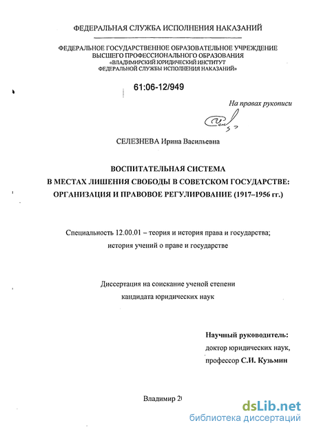 Апробация и внедрение в практику результатов исследования. Ре зультаты проведенного исследования, а также основанные на них выводы, положения и рекомендации прошли апробацию в процессе их обсуждения на кафедре государственно-правовых дисциплин Владимирского юридического института ФСИН России, при преподавании курсов «История отечественного государства и права», «Уголовно-исполнительное право» и могут быть использованы при написании курсовых и выпускных квалификационных работ. Основные положения, выводы и рекомендации диссертационного ис 1 следования отражены в 4 научных публикациях автора, использовались в учебном процессе, излагались в выступлениях на научно-практических конференциях: «Государство, право и управление» (г. Москва, апрель 2002 г.), «Исправительная система в годы Великой Отечественной войны» (г. Владимир, апрель 2005 г.), «Ресоциализация несовершеннолетних правонарушителей: культурно-правовой аспект проблемы» (г. Краснодар, 30 сентября 2005 г.); «Современная наука: тенденции, перспективы развития» (г. Владимир, 8 февраля 2006 г.).