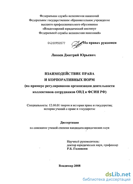Таким образом, следует констатировать, что в юридической науке отсутствуют теоретические исследования, посвященные системному анализу правового и корпоративного регулирования деятельности сотрудников ОВД и ФСИН.