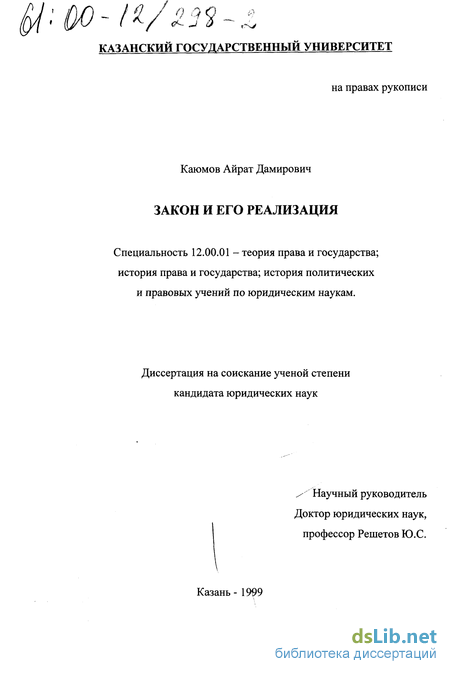 Целью диссертационного исследования является общетеоретическое исследование закона и его реализации.