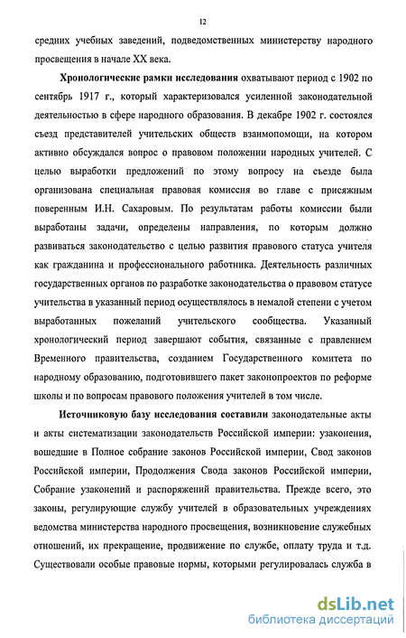 Хронологические рамки исследования охватывают период с 1902 по сентябрь 1917 г., который характеризовался усиленной законодательной деятельностью в сфере народного образования. В декабре 1902 г. состоялся съезд представителей учительских обществ взаимопомощи, на котором активно обсуждался вопрос о правовом положении народных учителей. С целью выработки предложений по этому вопросу на съезде была организована специальная правовая комиссия во главе с присяжным поверенным И.Н. Сахаровым. По результатам работы комиссии были выработаны задачи, определены направления, по которым должно развиваться законодательство с целью развития правового статуса учителя как гражданина и профессионального работника. Деятельность различных государственных органов по разработке законодательства о правовом статусе учительства в указанный период осуществлялось в немалой степени с учетом выработанных пожеланий учительского сообщества. Указанный хронологический период завершают события, связанные с правлением Временного правительства, созданием Государственного комитета по народному образованию, подготовившего пакет законопроектов по реформе школы и по вопросам правового положения учителей в том числе.