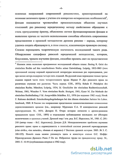 Степень разработанности темы. Предметом настоящей работы является фикция как прием юридической техники, поэтому философские течения, в частности, фикционализм Г. Файхингера, оказавший когда-то большое влияние на юридическую литературу, остаются за рамками нашего внимания -тем более что осмысление юридической фикции на основе одноименной философской категории встретило в свое время убедительную критику . Современные теории юридической фикции восходят в большинстве своем к исследованиям XIX века, которые концентрировались, главным образом, на изучении римского опыта. Изначальное единство историографической традиции не означает, разумеется, что выводы, полученные при анализе современного материала, можно автоматически распространять на Античность, но в то же время позволяет учитывать их при интерпретации данных, полученных из римских источников4.
