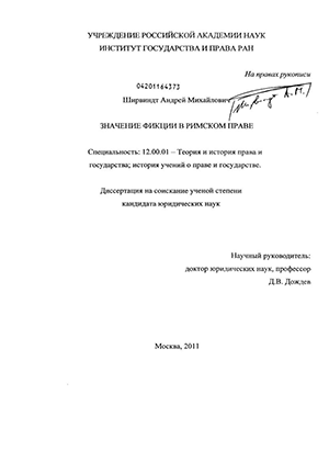 Ширвиндт A.M. Значение фикции в римском праве на примере Дигест Юстиниана // Труды Института государства и права Российской академии наук. 2010. № 1. С. 45-52 (0,4 п.л.); он же. Юридическая фикция в древнеримской формуле усыновления: к вопросу о зависимости правотворчества от нормативной структуры общества // Труды Института государства и права Российской академии наук. 2010. № 6. С. 59-72 (0,75 п.л.). Две статьи приняты в печать: он же. Значение фикции в римском праве на примере формулы усыновления (adrogatio) // Вестник древней истории. 2011. № 3 (1,8 п.л.); он же. Фикция в законодательстве об опеке // Древнее право. 2011. № 26 (1,7 п.л.).