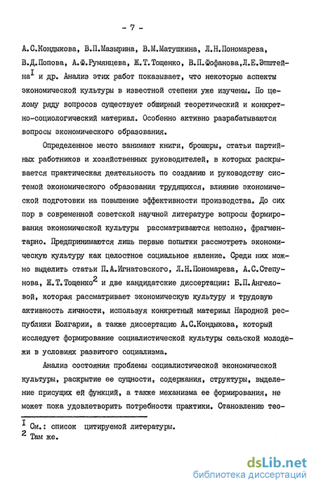 Определенное место занимают книги, брошюры, статьи партийных работников и хозяйственных руководителей, в которых раскрывается практическая деятельность по созданию и руководству системой экономического образования трудящихся, влияние экономической подготовки на повышение эффективности производства. До сих пор в современной советской научной литературе вопросы формирования экономической культуры рассматриваются неполно, фрагментарно. Предпринимаются лишь первые попытки рассмотреть экономическую культуру как целостное социальное явление. Среди них можно выделить статьи П.А.Игнатовского, Л.Н.Пономарева, А.С Степу-нова, Ж.Т.Тощенко и две кандидатские диссертации: Б.П.Ангело-вой, которая рассматривает экономическую культуру и трудовую активность личности, используя конкретный материал Народной республики Болгарии, а также диссертацию А.СКондыкова, который исследует формирование социалистической культуры сельской молодёжи в условиях развитого социализма.