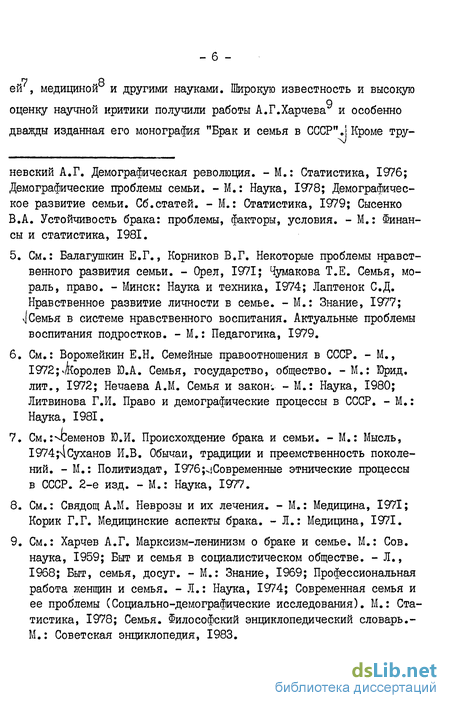 1. См.: Дарский Л.Е. Формирование семьи. - М.: Статистика, 1972; Белова В.А. Число детей в семье. - М.: Статистика, 1975; Виш- - б - ей , медициной и другими науками. Широкую известность и высокую оценку научной критики получили работы А.Г.Харчева и особенно дважды изданная его монография "Брак и семья в СССР"J Кроме тру- невский А.Г. Демографическая революция. -М.: Статистика, 1976; Демографические проблемы семьи. - М.: Наука, 1978; Демографическое развитие семьи. Сб.статей. - М.: Статистика, 1979; Сысенко В.А. Устойчивость брака: проблемы, факторы, условия. - М.: Финансы и статистика, 1981.
