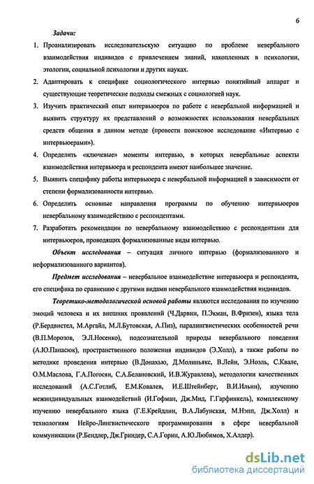 Теоретико-методологической основой работы являются исследования по изучению эмоций человека и их внешних проявлений (Ч.Дарвин, П.Экман, В.Фризен), языка тела (Р.Бердвистел, М.Аргайл, МЛ.Бутовская, А.Пиз), паралингвистических особенностей речи (В.П.Морозов, ЭЛ.Носенко), подсознательной природы невербального поведения (А.Ю.Панасюк), пространственного положения индивидов (Э.Холл), а также работы по методике проведения интервью (В.Донахью, Д.Молиньякс, ВЛейн, Э.Ноэль, С.Квале, О.М.Маслова, ГА.Погосян, СА.Белановский, И.В.Журавлева), методологии качественных исследований (А.С.Готлиб, Е.М.Ковалев, И.Е.Штейнберг, В.И.Ильин), изучению межиндивидуальных взаимодействий (И.Гофман, Дж.Мид, Г.Гарфинкель), комплексному изучению невербального языка (Г.Е.Крейдлин, В.АЛабунская, М.Нэпп, Дж.Холл) и технологиям Нейро-Лингвистического программирования в сфере невербальной коммуникации (Р.Бендлер, Дж.Гриндер, СА.Горин, А.ЮЛюбимов, Х.Алдер).