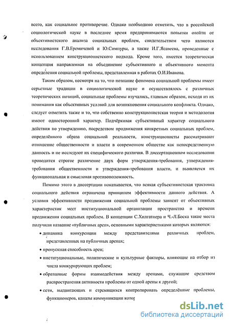 В диссертационном исследовании, вслед за конструкционистским определением социального действия как социального конфликта, социальные проблемы рассматриваются не как объективные статичные условия социальной реальности, а как определенные динамичные конструкции, представляющие собой деятельность по выдвижению утверждений-требований относительно предполагаемых условий. Таким образом, традиционная как для отечественной, так и для западной социологической науки объективистская трактовка социальных проблем как вида социальных условий уступает место субъективистскому пониманию социальных проблем как вида социальной деятельности по их формулировке и публичному продвижению.