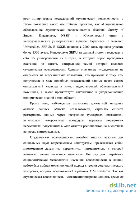 вовлеченности в данной работе был выбран моделирующий подход к теории социологического измерения, впервые обоснованный в работах Х.М. Блейлока. Так как студенческая вовлеченность - междисциплинарный концепт, время от времени появляющийся в работах зарубежных социологов образования, в диссертации мы расширим границы применения моделирующего подхода, используя его для разработки социологической методологии изучения данного объекта.