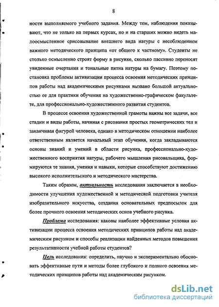 Большинство авторов считает, что процесс активизации обучения Г связан с осознанным подходом к учению, с соблюдением последователь- ности выполняемого учебного задания. Между тем, наблюдения показы- * вают, что не только на первых курсах, но и на старших можно видеть ма- лоосмысленное срисовывание внешнего вида натуры с несоблюдением важного методического принципа «от общего к частному». Студенты не столько осмысленно строят форму в рисунке, сколько пассивно переносят увиденные очертания и тональные пятна натуры на бумагу. Поэтому постановка проблемы активизации процесса освоения методических принципов работы над академическими рисунками вызвано большой актуальностью ее для практики обучения на художественно-графическом факультете, для профессионально-художественного развития студентов.
