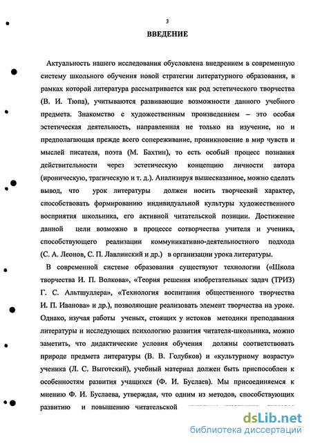 Рассмотренные выше положения и тенденции в теории творчества дают общие представления о творческом процессе, касающемся всех областей деятельности (наука, искусство, профессиональная и учебная деятельность). Что касается учебной деятельности, то, на наш взгляд, характер творческого процесса определяется спецификой преподаваемого предмета. Современные ученые-методисты рассматривают литературу как предмет эстетического цикла, изучение которого предполагает не только литературное развитие школьника-читателя, но и становление личности ученика, умеющего выработать активную читательскую позицию, сформированную в процессе творческого постижения художественного произведения (С. А. Леонов,