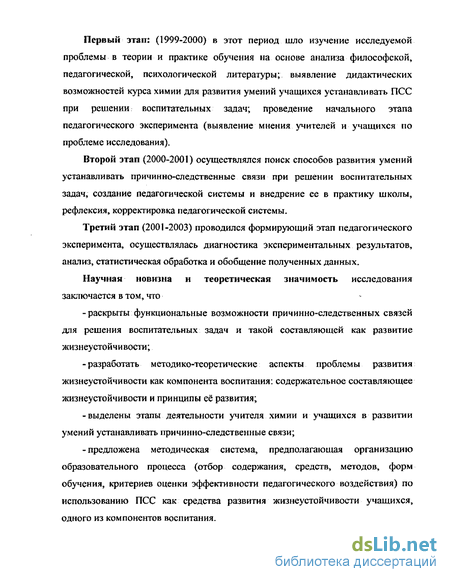 Первый этап: (1999-2000) в этот период шло изучение исследуемой проблемы в теории и практике обучения на основе анализа философской, педагогической, психологической литературы; выявление дидактических возможностей курса химии для развития умений учащихся устанавливать ПСС при решении воспитательных задач; проведение начального этапа педагогического эксперимента (выявление мнения учителей и учащихся по проблеме исследования).