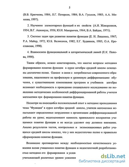 Таким образом, можно констатировать, что многие вопросы методики формирования понятия функции в курсе алгебры средней школы освещены достаточно полно. Однако в связи с потребностью современного образования, нацеленного на профильную и уровневую дифференциацию обучения, с существенными изменениями программ и учебников алгебры возникает необходимость в проведении специального исследования по выявлению методических особенностей дифференцированной работы учителя математики при формировании понятия функции.