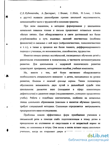 С.Л. Рубинштейн, А. Дистервег, J. Bruner, J. Jllich, Н. Lowe, J. Stohn и другие) выявили разнообразие причин школьной неуспеваемости, начинающейся часто с трудностей в освоении грамоты.