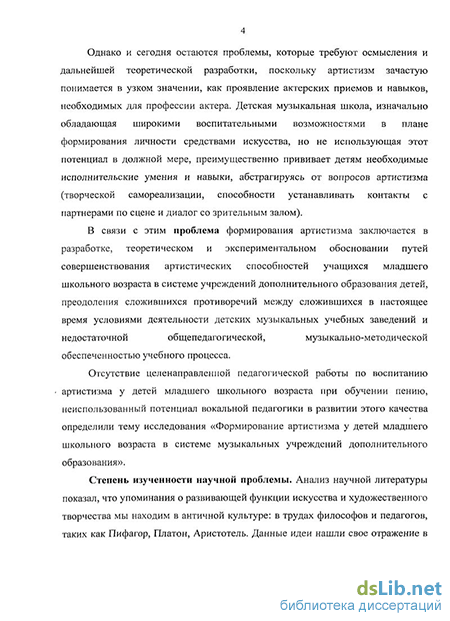 Отсутствие целенаправленной педагогической работы по воспитанию артистизма у детей младшего школьного возраста при обучении пению, неиспользованный потенциал вокальной педагогики в развитии этого качества определили тему исследования «Формирование артистизма у детей младшего школьного возраста в системе учреждений дополнительного образования».