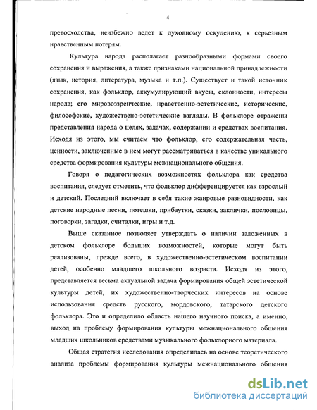 Выше сказанное позволяет утверждать о наличии заложенных в детском фольклоре больших возможностей, которые могут быть реализованы, прежде всего, в художественно-эстетическом воспитании детей, особенно младшего школьного возраста. Исходя из этого, представляется весьма актуальной задача формирования общей эстетической культуры детей, их художественно-творческих интересов на основе использования средств русского, мордовского, татарского детского фольклора. Это и определило область нашего научного поиска, а именно, выход на проблему формирования культуры межнационального общения младших школьников средствами музыкального фольклорного материала.