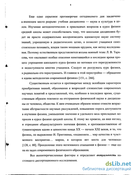 Еще одно серьезное противоречие сегодняшнего дня заключено в имеющем место разрыве: учебная дисциплина — наука и культура в целом. Изучение методологических и прикладных вопросов в курсе физики средней школы может способствовать тому, что школьная дисциплина будет не просто содержательно воспроизводить адекватную науке систему знаний, упрощенную в дидактических целях, а позволит учащимся самостоятельно познавать, владея таким мощным орудием, как метод исследования. Поэтому естественным представляется весьма важный тезис Л. В. Тарасова, что «вызывает особые опасения наметившийся в последнее время процесс упрощения школьного курса физики по мотивам его перегруженности и недоступности многим учащимся. Следует не разгружать курс физики, а радикально его перестраивать. И главное в этой перестройке — обращение к идеям методологии современной физики» [151, с. 266].