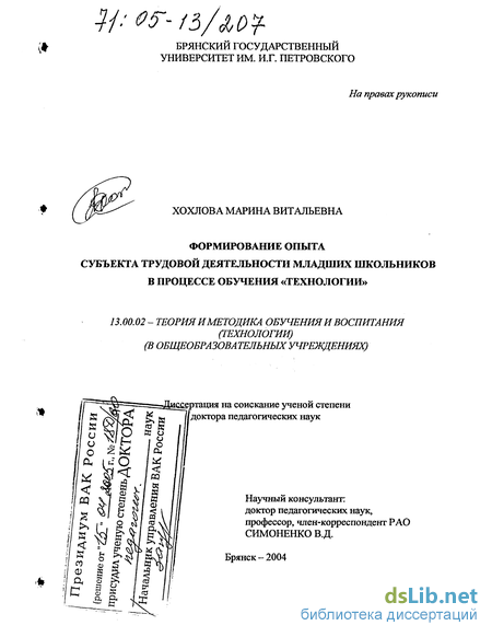 Апробация и внедрение результатов осуществлялись на протяжении всего периода исследования. Основные положения диссертации неоднократно обсу ждались и были одобрены в. Брянском государственном университете (на кафедрах общей и профессиональной педагогики; общей и профессиональной психологии; технологии и предпринимательства, на методических семинарах преподавателей вузов и учителей начальных классов), Брянском и Красноярском институтах повышения квалификации работников образования, на межвузовских и всероссийских научно-практических конференциях (гг. Тула - 1995, Брянск - 1997, 2000, 2002, 2003, Армавир - 2002, Сыктывкар - 2002, Ульяновск - 2003, Курск -2003). Основные положения и результаты исследования представлены в материалах учебников, методических пособий, научных статей, опубликованных в центральных и региональных издательствах, межвузовских сборниках научных трудов (гг. Москва - 2004, Минск - 2004, Брянск - 2002, 2003, 2004, Иркутск - 2002, Шадринск - 2003, Новосибирск - 2003, Новокузнецк - 2003). Теоретические и методические аспекты работы апробировались в процессе обучения учащихся начальных классов в школах Брянска и Брянской области, а также Красноярского края, в процессе вузовской подготовки будущих учителей начальных классов в БГУ с 1996 по 2003 гг., а также во время повышения квалификации и переподготовки учителей на базе БИПК РО, КК ИПК РО.