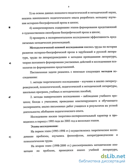 Методологической основой исследования явились труды по истории развития историко-биографической прозы в зарубежной и русской литературе, труды по литературоведению и методике преподавания литературы, теория поэтапного формирования умственных действий и исследования психологов по формированию представлений.