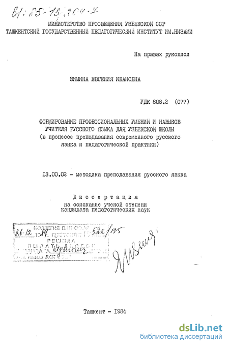 Зимина Евгения Ивановна. Формирование профессиональных умений и навыков учителя русского языка для узбекской школы (в процессе преподавания современного русского языка и педагогической практики) : ил РГБ ОД 61:85-13/204