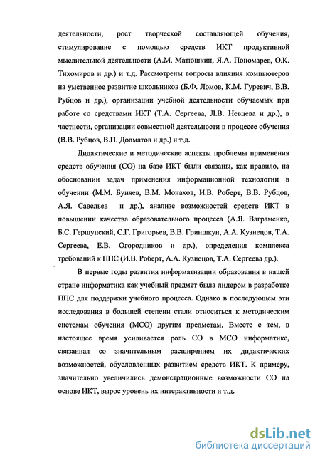 Дидактические и методические аспекты проблемы применения средств обучения (СО) на базе ИКТ были связаны, как правило, на обосновании задач применения информационной технологии в обучении (М.М. Буняев, В.М. Монахов, И.В. Роберт, В.В. Рубцов, А.Я. Савельев и др.), анализе возможностей средств ИКТ в повышении качества образовательного процесса (А.Я. Ваграменко, Б.С. Гершунский, С.Г. Григорьев, В.В. Гриншкун, А.А. Кузнецов, Т.А. Сергеева, Е.В. Огородников и др.), определения комплекса требований к ППС (И.В. Роберт, А.А. Кузнецов, Т.А. Сергеева др.).