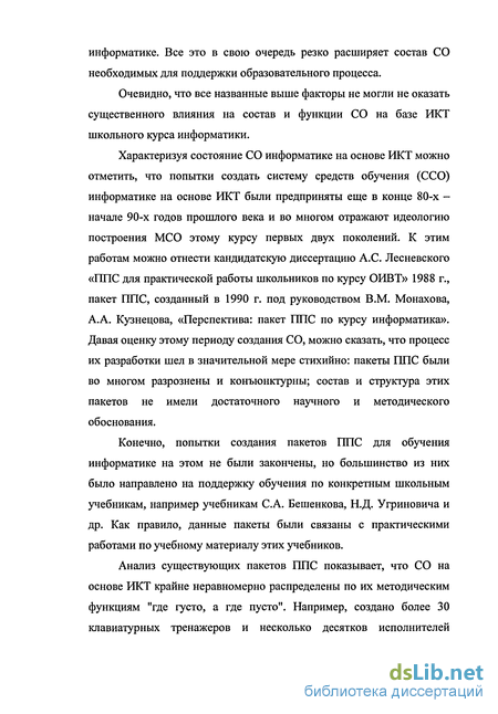 Характеризуя состояние СО информатике на основе ИКТ можно отметить, что попытки создать систему средств обучения (ССО) информатике на основе ИКТ были предприняты еще в конце 80-х -начале 90-х годов прошлого века и во многом отражают идеологию построения МСО этому курсу первых двух поколений. К этим работам можно отнести кандидатскую диссертацию А.С. Лесневского «ППС для практической работы школьников по курсу ОИВТ» 1988 г., пакет ППС, созданный в 1990 г. под руководством В.М. Монахова, А.А. Кузнецова, «Перспектива: пакет ППС по курсу информатика». Давая оценку этому периоду создания СО, можно сказать, что процесс их разработки шел в значительной мере стихийно: пакеты ППС были во многом разрознены и конъюнктурны; состав и структура этих пакетов не имели достаточного научного и методического обоснования.