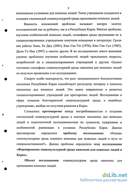 Сложилось противоречие между востребованностью в создании специальной социокультурной среды в платных пансионах для пожилых людей и недостаточной исследованностью их сущности, содержания и особенностей реализации в условиях Республики Корея. Данное противоречие определило проблему исследования: «Каковы социокультурная среда платного пансиона для пожилых людей и пути ее совершенствования?». Данная проблема определила тему исследования «Формирование социокультурной среды пансиона для пожилых людей в Корее».