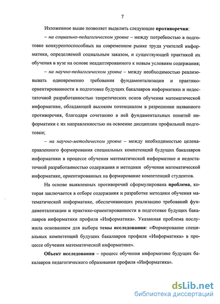 на научно-педагогическом уровне - между необходимостью реализовы-вать одновременно требования фундаментализации и практико-ориентированности в подготовке будущих бакалавров информатики и недостаточной разработанностью теоретических основ обучения математической информатике, обладающей высоким потенциалом в разрешении названного противоречия, благодаря сочетанию в ней фундаментальных понятий информатики с их направленностью на освоение дисциплин профильной подготовки;