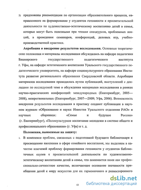Положения, выносимые на защиту: і. В комплексе проблем, связанных с подготовкой будущего библиотекаря к просвещению населения в сфере семейного воспитания, мы выделяем в качестве ключевой проблему формирования готовности у студентов библиотечных ссузов к просветительской деятельности по художественно-эстетическому воспитанию детей в семье, что понимается нами как профессионально-личностное качество, включающее осознание значимости приобщения детей к миру искусства для их гармоничного и разностороннего