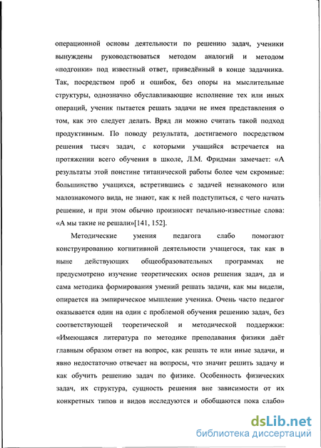 Методические умения педагога слабо помогают конструированию когнитивной деятельности учащегося, так как в ныне действующих общеобразовательных программах не предусмотрено изучение теоретических основ решения задач, да и сама методика формирования умений решать задачи опирается в основном на эмпирическое мышление ученика. Очень часто педагог оказывается один на один с проблемой обучения решению задач, без соответствующей теоретической и методической поддержки. Имеющаяся литература по методике преподавания физики даёт главным образом ответ на вопрос, как решать те или иные задачи, и явно недостаточно отвечает на вопросы, что значит решить задачу и как обучить решению задач по физике. Особенность физических задач, их структура, сущность решения вне зависимости от их конкретных типов и видов исследуются и обобщаются пока слабо.