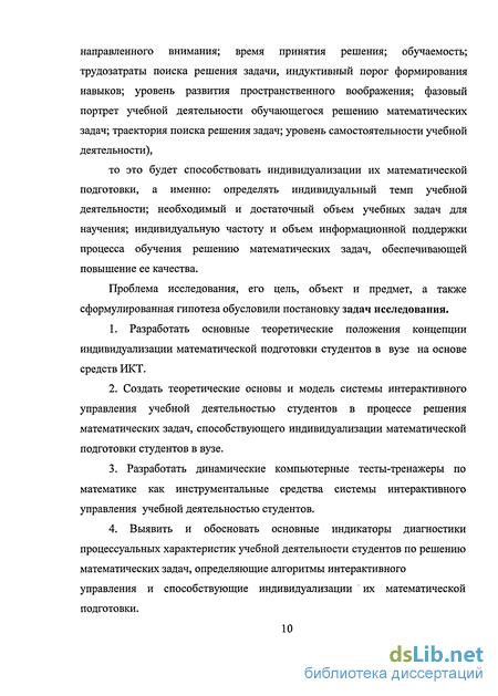 Цель исследования: разработать концепцию индивидуализации математической подготовки студентов на основе интерактивного управления их учебной деятельностью средствами ИКТ и методику ее реализации.