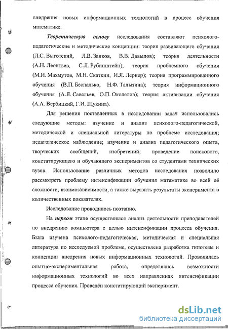 Теоретическую основу исследования составляют психолого-педагогические и методические концепции: теория развивающего обучения (Л.С.Выготский, Л.В. Занков, В.В.Давыдов); теория деятельности (А.Н. Леонтьев, С.Л. Рубинштейн); теория проблемного обучения (М.И. Махмутов, М.Н. Скаткин, И.Я. Лернер); теория программированного обучения (В.П. Беспалько, Н.Ф. Талызина); теория информационного обучения (А.Я. Савельев, О.П. Околелов); теория активизации обучения (А.А. Вербицкий, Г.И. Щукина).