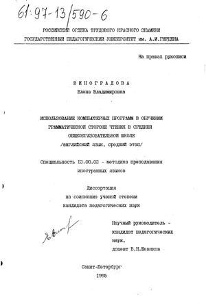 деятельностного подхода применительно к обучению рецептивной грамматике; обосновывается необходимость создания управляемой модели формирования рецептивных грамматических навыков чтения; анализируется дидактико-методический потенциал компьютерных программ различных видов при формировании, коррекции и совершенствовании рецептивных грамматических навыков чтения; описывается компьютерная модель обучения на основе комплексного использования компьютерных программ.