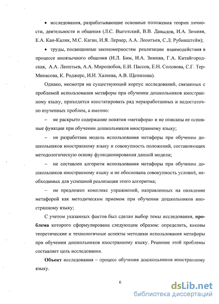 Однако, несмотря на существующий корпус исследований, связанных с проблемой использования метафоры при обучении дошкольников иностранному языку, приходится констатировать ряд неразработанных и недостаточно изученных проблем, а именно:
