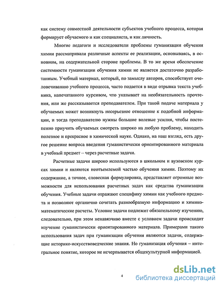 Многие педагоги и исследователи проблемы гуманизации обучения химии рассматривали различные аспекты ее реализации, основываясь, в основном, на содержательной стороне проблемы. В то же время обеспечение системности гуманизации обучения химии не является достаточно разработанным. Учебный материал, который, по замыслу авторов, способствует очеловечиванию учебного процесса, часто подается в виде отрывка текста учебника, напечатанного курсивом, что указывает на необязательность прочтения, или же рассказывается преподавателем. При такой подаче материала у обучаемых может возникнуть несерьезное отношение к подобной информации, и тогда преподавателю нужны большие волевые усилия, чтобы постепенно приучить обучаемых смотреть широко на любую проблему, находить полезное и прекрасное в химической науке. Однако, на наш взгляд, есть другое решение вопроса введения гуманистически ориентированного материала в учебный предмет - через расчетные задачи.