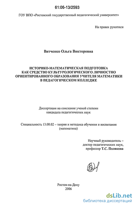 Предмет - историко-математическая подготовка учителя математики в педагогическом колледже в условиях культурологического личностно ориентированного образования.
