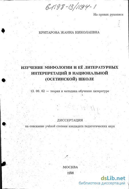 Литературное образование в национальной (осетинской). школе основывается на материале трёх литератур: родной, русской и зарубежной.. Литература зиждется на основах народного творчества мифологии. Традиционно считалось,-что образованньгй и культурный человек должен знать мифологию Египта, Древней Греции и Рима, но не родную. Наста-, ло время по-другому отнестись к изучению, прошлого своего народа, включая мифологию. Время обязывает постоянно напоминать обществу об эстетических ценностях, выработанных нашими предками и переданных нам в наследство, более глубоко изучать шедевры литературы. Миф . же является одним из чрезвычайно «сложных реальностей культуры, его можно изучать и интерпретировать в самых многочисленных и взаимодополняющих аспектах» (150, с. 15).