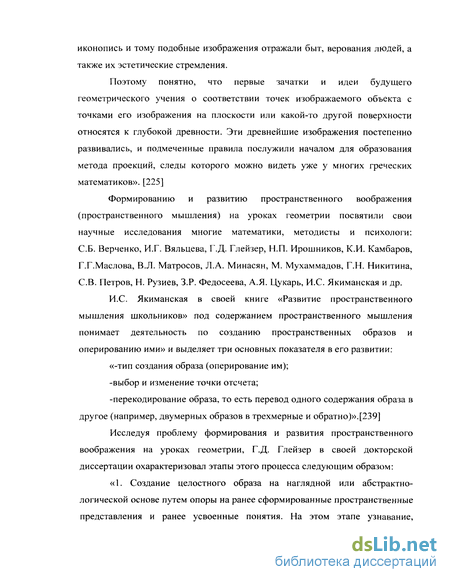 Формированию и развитию пространственного воображения (пространственного мышления) на уроках геометрии посвятили свои научные исследования многие математики, методисты и психологи: СБ. Верченко, И.Г. Вяльцева, Г.Д. Глейзер, Н.П. Ирошников, К.И. Камбаров, Г.Г.Маслова, В.Л. Матросов, Л.А. Минасян, М. Мухаммадов, Г.Н. Никитина, СВ. Петров, Н. Рузиев, З.Р. Федосеева, А.Я. Цукарь, И.С Якиманская и др.