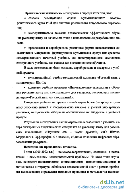 На первом этапе исследования - поисково-теоретическом (2000-2002 гг.) -производилась постановка и осмысление исследовательской проблемы; изучалась психолого-педагогическая, лингвистическая, психолингвистическая и методическая литература; обобщался педагогический опыт в рамках проблемы исследования; определялись исходные принципы и методология исследовательского поиска; формировалась концепция мультимедийного вводно-фонетического курса РКИ (МВФК РКИ).